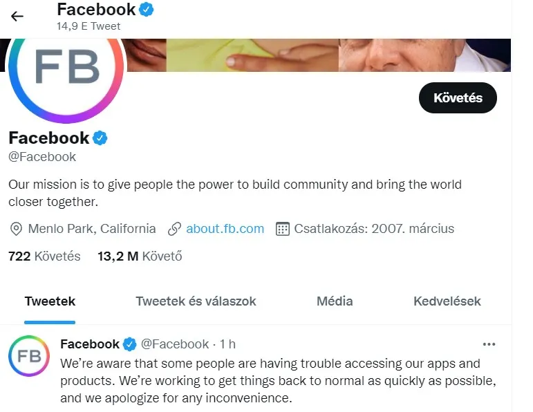A Twitteren található hivatalos csatornáján üzent a Facebook. Az alábbiakat írták: „Tisztában vagyunk azzal, hogy egyesek nehezen férnek hozzá alkalmazásainkhoz és termékeinkhez. Azon dolgozunk, hogy a lehető leggyorsabban helyreálljanak a dolgok, és elnézést kérünk az esetleges kellemetlenségekért.”