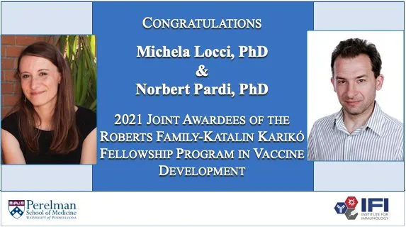 „Micsoda nagyszerű hír: Pardi Norbert és olasz kutatótársa, Michela Locci lettek a University of Pennsyvania rólam elnevezett ösztöndíj első jutalmazottjai!” – írta boldogan Karikó Katalin a közösségi oldalán pénteken, soraihoz pedig az alábbi képet mellékelte: