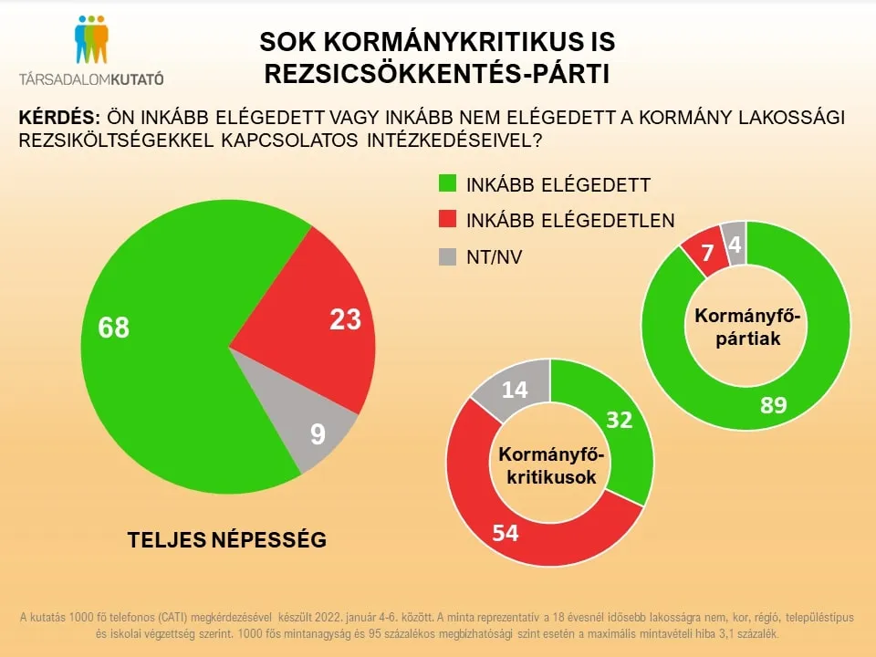 A Társadalomkutató januári kutatása alapján a magyar lakosság több mint kétharmada (68 százalék) „inkább elégedett” a rezsicsökkentéssel (23 százaléka nem elégedett). A politikai oldalak közötti megosztottság sem feltétlenül rajzolódik ki a kérdésben: a kormánykritikusok közel egyharmada (32 százalék) vélekedik pozitívan az energiaárakat szabályzó intézkedésről és csak kicsit több mint felük elégedetlen (54 százalék). A kormánnyal szimpatizálók közt tízből kilencen (89 százalék) elégedettek a programmal. Az ismeretlen pártpreferenciával rendelkezők 55 százaléka is elégedett (19 százalék elégedetlen), azaz teljesen nyilvánvaló, hogy a rezsicsökkentés megszüntetésének ígéretével politikai tábor nem növelhető.