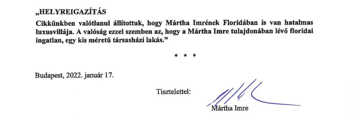 Milliárdok egymillió-hatszázkilencvenezerért? A Metropol megszerezte a strómanszerződést! Prisztás-villa, Bentley, floridai luxuslakás, óceánparti sziget, amelyen úgy tudni, egy reneszánsz villa épül… De a legfrissebb információk szerint ez még nem minden. Klasszikus strómanszerződést juttattak el a Metropol szerkesztőségébe. A dokumentum arra bizonyíték, hogy milyen módszerekkel rejtik el a vagyonukat a baloldali közszereplők, köztük a Gyurcsány-fiókának gúnyolt Mártha Imre, aki a DK-elnök miniszterelnöksége alatt jutott először magas vezető pozíciókhoz, például a Magyar Villamos Műveknél – olvasható a Metropol cikkében.