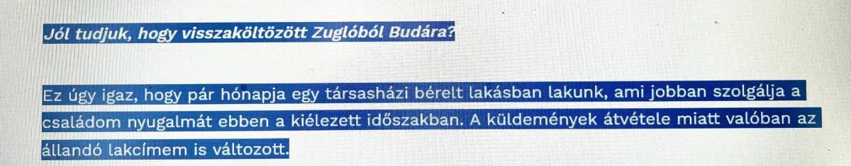 „Karácsony Gergely és családja a tavalyi év közepe óta egy II. kerületi bérelt lakásban él. A főpolgármester erről korábban már maga is beszélt a nyilvánosságban, az előválasztás mindkét fordulójában egy II. kerületi szavazóhelyiségben szavazott” – írta a nyomban előrántott Telex megkeresésére a főpolgármester sajtóosztálya. Hozzátették, hogy a főpolgármester és családja egy magánszemélytől bérli az ingatlant. ”