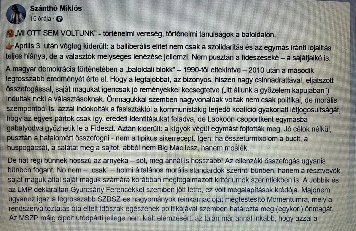 Szánthó Miklós, az Alapjogokért Központ igazgatója a Facebookon fejtette ki gondolatait a választásokkal kapcsolatban.