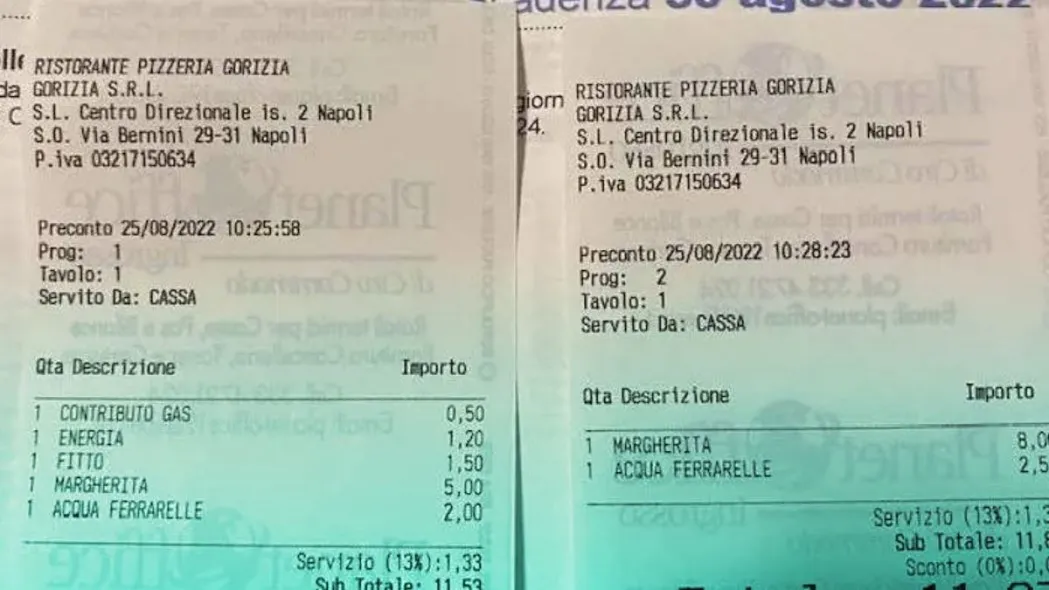 Most egy nápolyi pizzéria tulajdonosa úgy döntött, mindenki számára világossá teszi. hogy a korábbi pizzás menüjének ára miért nőtt mintegy másfélszeresére. Az il Giornale nevű olasz lap számolt be Salvatore Antonio Grasso, a nápolyi Gorizia pizzéria tulajdonosának figyelemfelhívó akciójáról. A drága energiaszámlákkal szembesülő vállalkozó Facebook -profilján egy bejegyzést tett közzé egy általa kreált nyugta képével. (Fotónk bal oldalán- a szerk.) Grasso ezen a margherita pizza 5 eurós és a víz 2 eurós árához hozzácsapta az 50 centes gáz, a 1,20 eurós áram árát és az 1,50 eurós bérleti díjat, plusz a 13 %-os, 1,33 eurós szervizdíjat. Így jött ki a 11,53 eurós ár. A jobb oldalon látható számlán a pizza ára az előzőek miatt nőtt 8, a víz ára pedig 2,5 euróra.