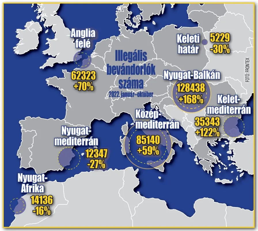 Az idei év első tíz hónapjában a Frontex elemzőinek előzetes számításai szerint 275 500 szabálytalan beutazást észleltek az Európai Unió külső határain. Ez 73%-os növekedést mutat az előző év azonos időszakához képest, és 2016 óta ebben az időszakban érkeztek a legtöbben illegálisan az Európai Unióba. Továbbra is a nyugat-balkáni útvanolon a legnagyobba "forgalom", de a Kelet-és a Közép-Mediterrán térségbe is sokan érkeztek, és érkeznek továbbra is. Elmondható, hogy az energiaválság és az évszázad inflációjának árnyékában a migrációs hullám bevándorlási cunamivá tornyosul.