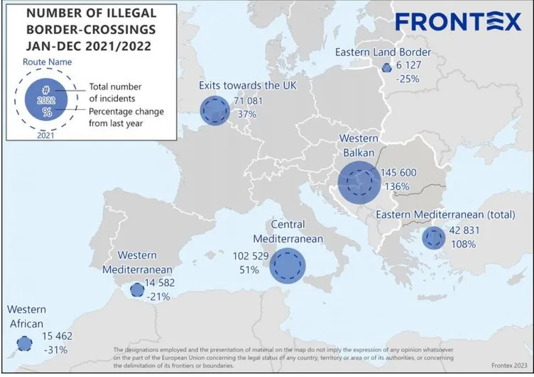 Az EU határ- és partvédelmi ügynöksége (Frontex) előzetes számításai szerint 330 ezer szabálytalan beutazást észleltek az Európai Unió külső határain. Ez a legmagasabb szám 2016 óta, és 64%-os a növekedés 2021-hez képest. A járvány okozta 2020-as mélypont után ez volt a második olyan év egymás után, amikor meredeken emelkedett a bevándorlók száma.