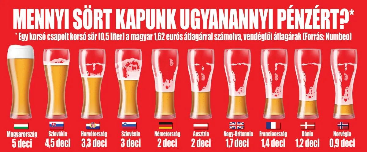 A Numbeo összehasonlító portál adatai szerint Magyarországon olcsónak számít a csapolt sör. Mutatjuk, hogy ugyanannyi pénzért, amennyibe idehaza egy korsó sör kerül, más európai országokban mennyi sört mérnének a korsónkba. Az biztos, Norvégiában szomjan maradnánk, hacsak ki nem fizetjük kedvenc italunkért a mintegy 3600 forintnyi norvég koronát, vagy az egyszerűség kedvéért közel 9 eurót.