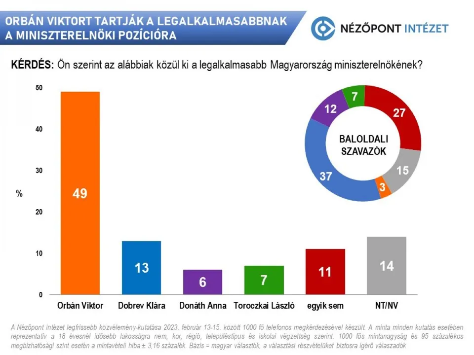 A magyarok többsége (49 százalék) Orbán Viktort tartja a legalkalmasabbnak arra, hogy Magyarország miniszterelnöke legyen – derül ki a Nézőpont Intézet aktuális kutatásából. Kevesebb mint harmad annyian (13 százalék) tartanák a legjobb választásnak Dobrev Klárát, s ennél is jóval kisebb arányban Toroczkai Lászlót (7 százalék) vagy Donáth Annát (6 százalék). A baloldali szavazók negyede nem talál alkalmas jelöltet.