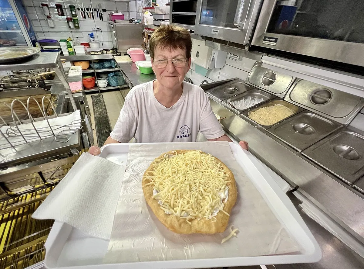 – mondta a vállalkozó, majd megengedte, hogy a konyhán megtekintsük, hogyan készül a lángos. A Kati mamaként bemutatkozó nyugdíjas hölgy hosszú évek óta a szakmában tevékenykedik, a szezonon kívül leginkább az iskolában készít hasonló finomságokat.