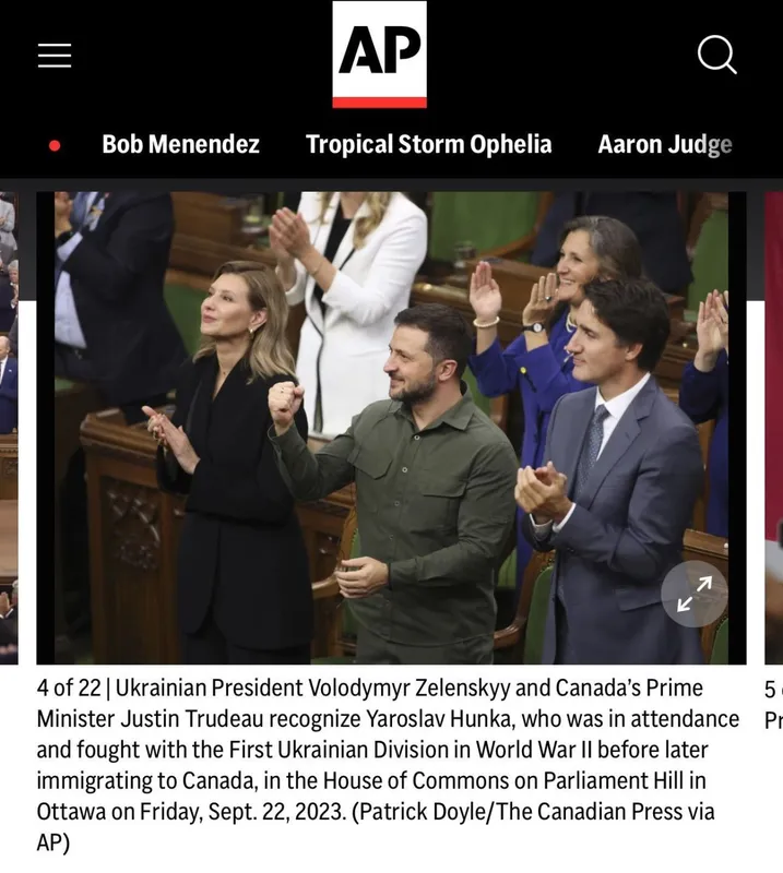 Amit az amerikai hírügynökség „az első ukrán hadosztály”-ként írt le, az valójában az SS 14. Waffengrenadier-hadosztálya volt, amelyet 1. galíciai hadosztályként is ismertek, emlékeztet az Orosz Hírek, hozzátéve: hasonló képeket osztott meg az AFP, amely a 98 éves Hunkát „kanadai–ukrán háborús veteránként” jellemezte és nem tett említést arról, hogy valójában a nácik oldalán harcolt.
