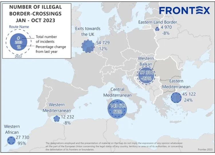 Az Európai Unió határ- és partvédelmi ügynöksége (Frontex) összesítése szerint az év első tíz hónapjában 331 600 ember próbált meg illegális módon az Európai Unió területére lépni. A jelentés kiemeli, hogy legutóbb 2015-ben volt ilyen magas az illegális bevándorlók száma az év első tíz hónapjában.