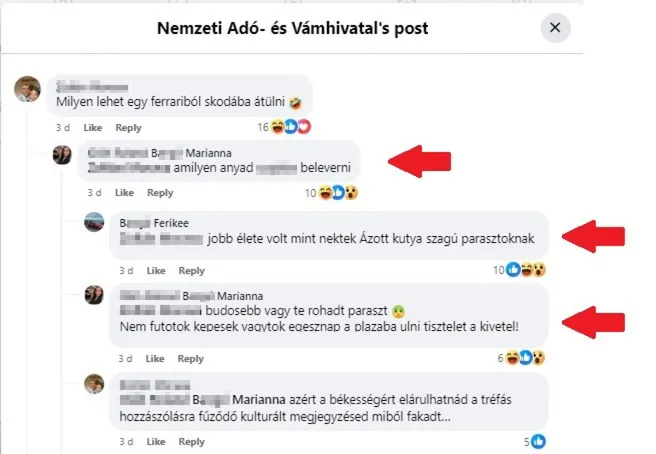 Közölhetetlen, ocsmány módon gyalázkodó kifejezésekkel rontott rá a NAV-ra a nemrég leleplezett milliárdos mogyoródi adócsalók családja. A NAV Facebook-oldalán ettől kitört a kommentháború, amitől még jobban bevadultak az "érintettek". Akinek a bejegyzése nem tetszett azt szintén gyalázni kezdték a lehető legdurvább stílusban.