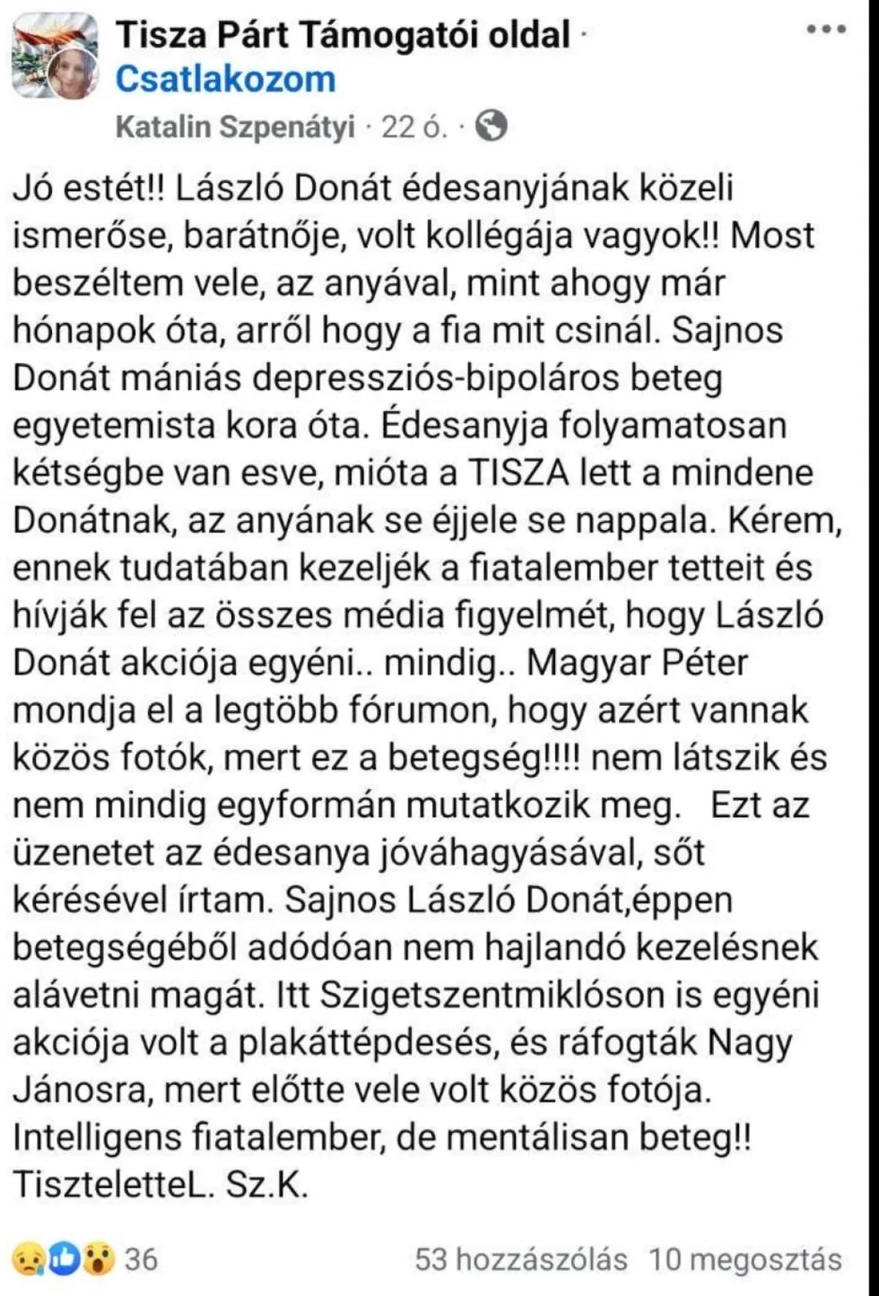 A Tisza pártban azonnal megkezdődött László Donát "mosdatása". Megpróbálják mentálisan beteg, zavart embernek beállítani.
