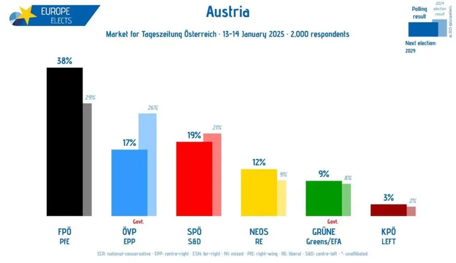 Nemcsak vezeti a pártversenyt a Patrióták Európáért-frakció (PfE) alapítójának és egyben a 2024. szeptember 29-ei választások nyertesének számító Osztrák Szabadságpárt (FPÖ) egy friss közvélemény-kutatás szerint, de támogatottsága meghaladja a két nagy párt, az Osztrák Néppárt (ÖVP) és az Osztrák Szociáldemokrata Párt (SPÖ) összesített támogatását.