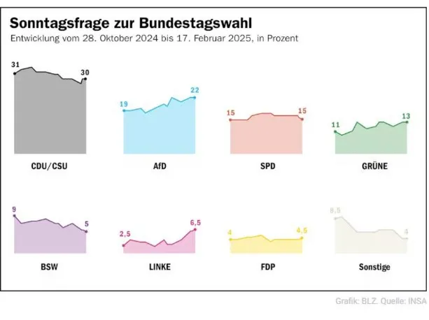 Sorra jelennek meg a közvélemény-kutatások a pártok támogatottságáról. A felmérések szerint a CDU/CSU nyeri meg a választásokat, Friedrich Merz lesz a kancellár, de hogy melyik pártokkal köt koalíciót, az majd csak az eredmények összeszámolása után derül ki. A szavazók jelentős százaléka még bizonytalan abban, hogy kire voksoljon, ami kérdésessé teszi, hogy milyen pártok lépnek majd koalícióra, hogy a következő négy évben vezessék Európa súlyos problémákkal küzdő vezető hatalmát.
