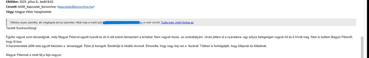 Miután a Bors beszámolt Magyar Péter múlt heti olaszországi nyaralásáról, ahol fotók és szemtanúk szerint" idegesen folyamatosan nyomkodta a telefont", levél érkezett a Bors email címére (név, elérhetőség a szerkesztőségben):