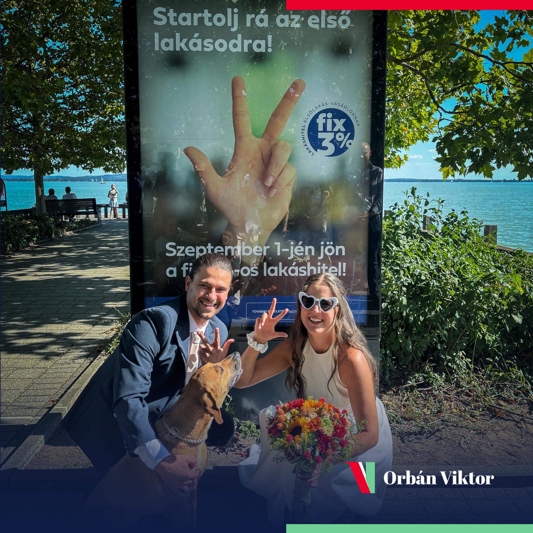 Friss házasok fotózkodnak a fix 3 százalékos kamatozású lakáshitel plakátja előtt. A szeptember elsején induló Otthon Start program iránt óriási érdeklődés van (Kép forrása: Facebook/Orbán Viktor)