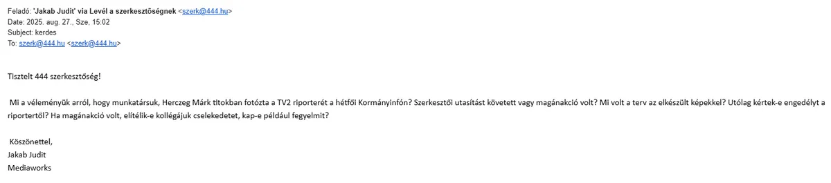 Sokakat felháborított, hogy "titokban" más újságírókat fotózott, személyes információk megszerzésével próbálkozott a Kormányinfón a 444 munkatársa, bizonyos Herczeg Márk. Szemmel láthatóan nem a sajtótájékoztató, hanem egészen más miatt akkreditáltatta magát.