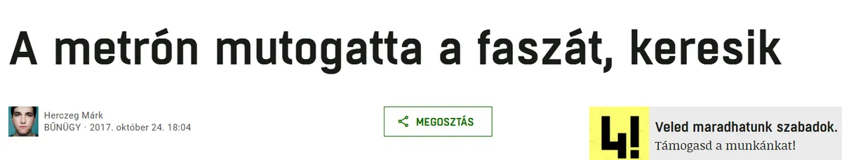 De sokan emlékezhetnek arra is, hogy az alábbi címmel írt cikket egy rendőrségi körözésről: “A METRÓN MUTOGATTA A FASZÁT, KERESIK”.