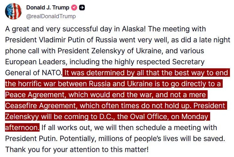 Trump elnök legutóbbi közösségi média bejegyzésében világossá tette, hogy hosszabb távon is békét biztosító, mindkét fél érdekeit figyelembe vevő békeszerződést akar elérni és nem egy bizonytalan kimenetelű tűzszünet a célja. Hétfő délután Washingtonban Zelenszkijjel folytatja a tárgyalásokat.