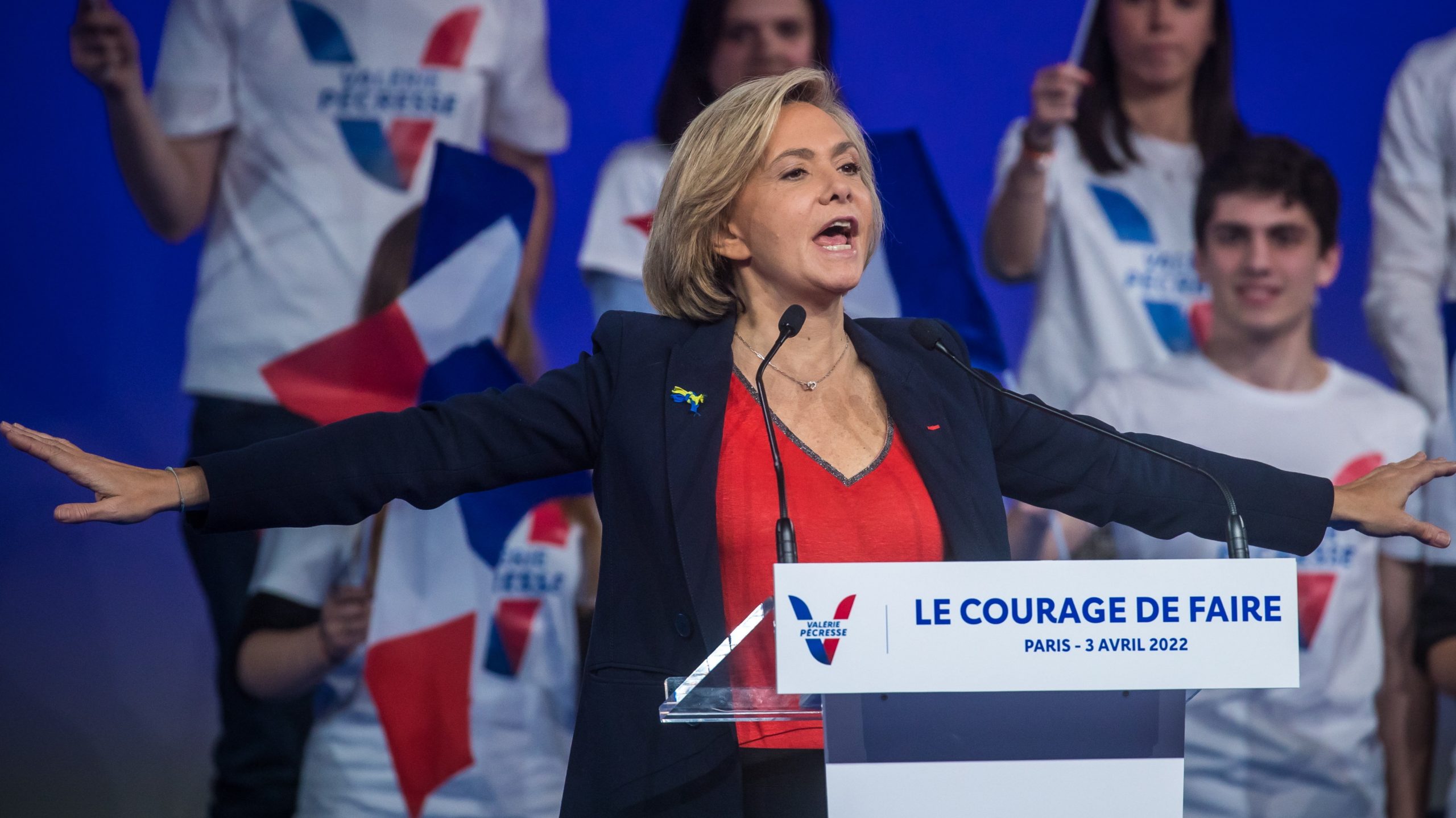 Valérie Pécresse, a jobbközép Köztársaságiak párt elnökjelöltje beszél támogatóihoz egy párizsi kampányrendezvényen 2022. április 3-án. Kirepülne Macron szárnyai alól (Fotó: MTI/EPA/Christophe Petit Tesson)
