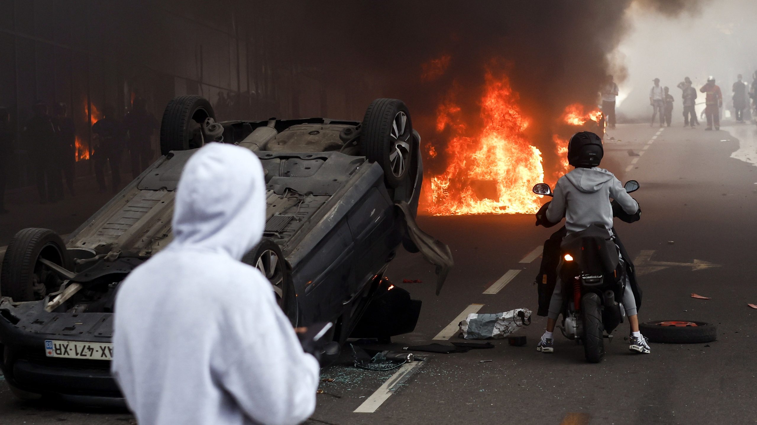 Egy Nanterre-ben lelőtt, társaival egy lopott autón, nagy sebeséggel száguldozó 17 éves, Nahel Merouk nevű autótolvaj halálának ürügyén fosztogató, gyújtogató csőcselék terrorizálta éjjelente Párizst és számos más francia nagyvárost 2023 nyarán. Az ügyészség keményen fellépett – az intézkedő rendőrrel szemben (Fotó: MTI/EPA/Yoan Valat)