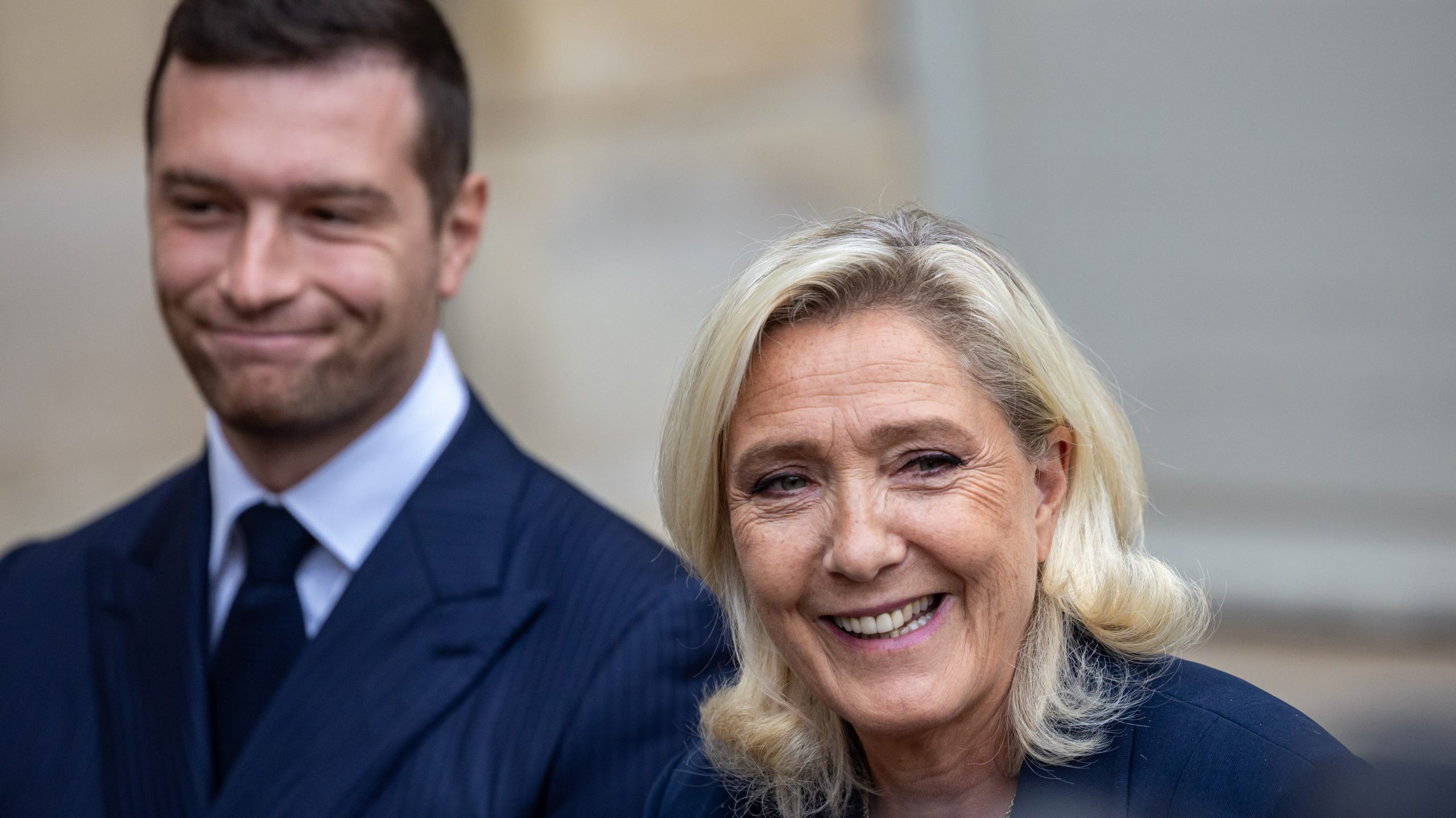 Marine Le Pen, a francia ellenzéki Nemzeti Tömörülés (RN) frakcióvezetője és Jordan Bardella pártelnök, a Patrióták Európáért (PfE) európai parlamenti frakció elnöke nyilatkozik a sajtó munkatársainak, miután Francois Bayrou miniszterelnökkel egyeztettek a párizsi kormányfői hivatalban, a Matignon-palotában 2025. szeptember 2-án, hat nappal a Bayrou-kormányról tartandó parlamenti szavazás előtt. Nevetve győzne? (Fotó: MTI/EPA/Christophe Petit Tesson)