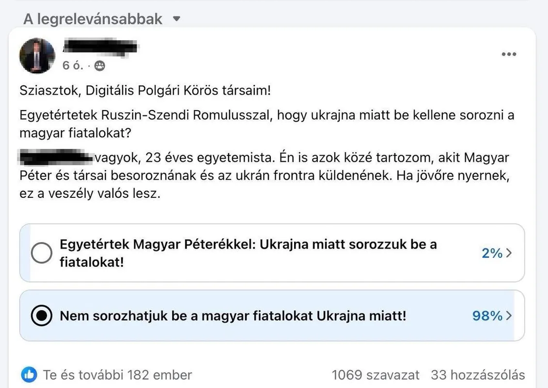 A válaszadók 98 százaléka elutasította Ruszin-Szendi Romulusz azon javaslatát, hogy állítsák vissza a kötelező sorkatonaságot Magyarországon. A tiszás politikus terveivel mindössze az emberek 2 százaléka értetett egyet abban a felmérésben, amit egy 23 éves egyetemista fiú tett közzé egy Digitális Polgári Kör - több tízezer tagot számláló - Facebook-csoportjában.