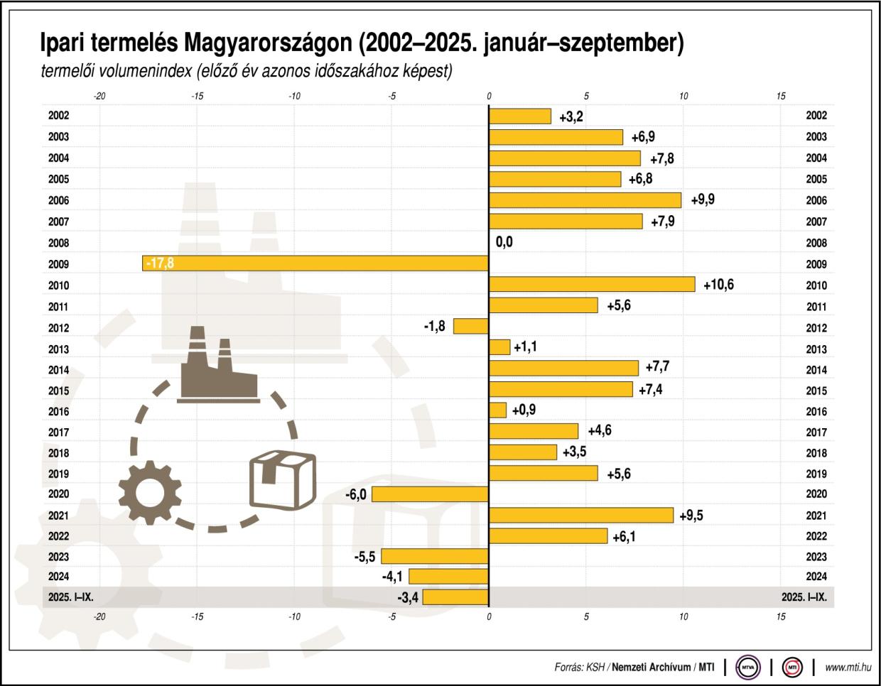 Az év első kilenc hónapjában 3,4 százalékkal kisebb volt ipari termelés, mint 2024 azonos időszakában.