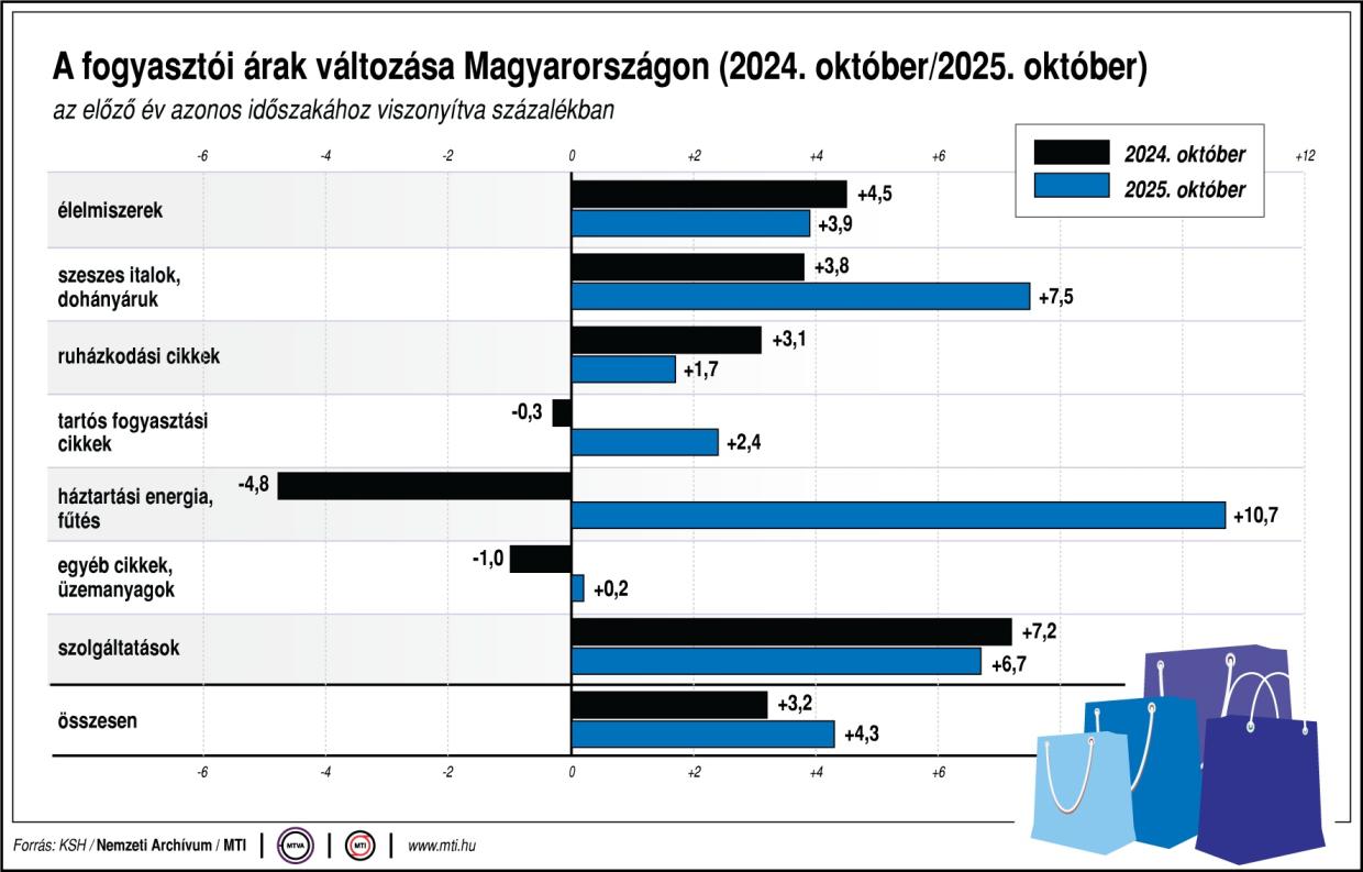 2025. októberben a fogyasztói árak átlagosan 4,3 százalékkal haladták meg az egy évvel korábbiakat. Szeptemberhez viszonyítva átlagosan nem változtak az árak - jelentette kedden a Központi Statisztikai Hivatal (KSH).