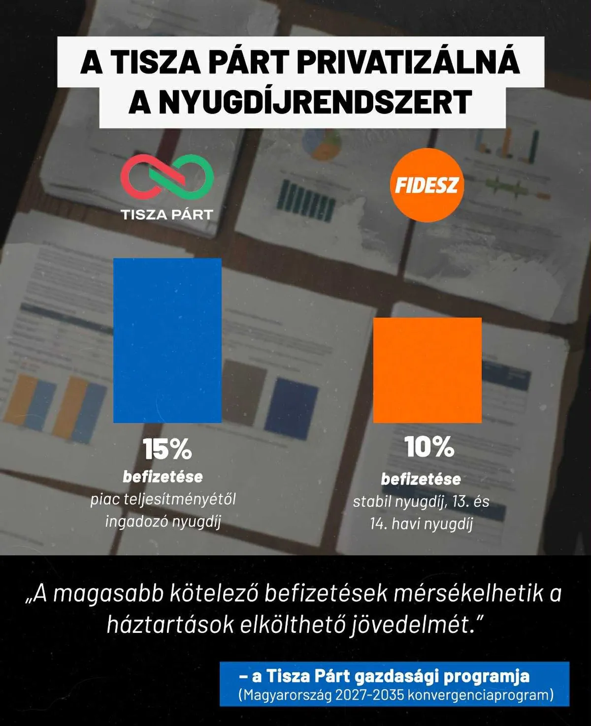 A Tisza Párt azt akarja, hogy az állam vonuljon ki a nyugdíjak mögül, és a dolgozók kötelezően külföldi magánpénztárakba fizessenek. Vagyis a nyugdíjvagyon átkerülne magánbiztosítókhoz, pénzügyi csoportokhoz. Egy ilyen rendszerben csak ők járnának jól, nem az emberek.