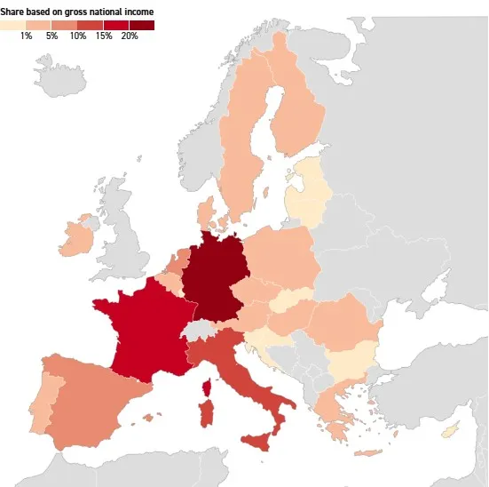 A belgáknak nyújtandó pénzügyi védőháló országonkénti főlosztását a POLITICO ismertette. A befagyasztott orosz eszközök mintegy 185 milliárd eurója a brüsszeli székhelyű Euroclearnél van, míg további 25 milliárd euró a blokkban magánbankszámlákon. Ez így összesen 210 miiliárd eurót tesz ki. Ebből baj esetén Németországnak 52 milliárd euróval kellene helyt állnia. A jóvátételi hitelgaranciákat országonkénti összegét az egyes tagállamok bruttó nemzeti jövedelmük (GNI) alapján számolták ki.