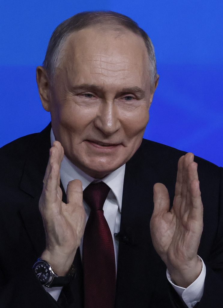 Vlagyimir Putyin orosz elnök év végi sajtóértekezletén a moszkvai Gosztyinnij Dvorban 2025. december 19-én. (Fotó: