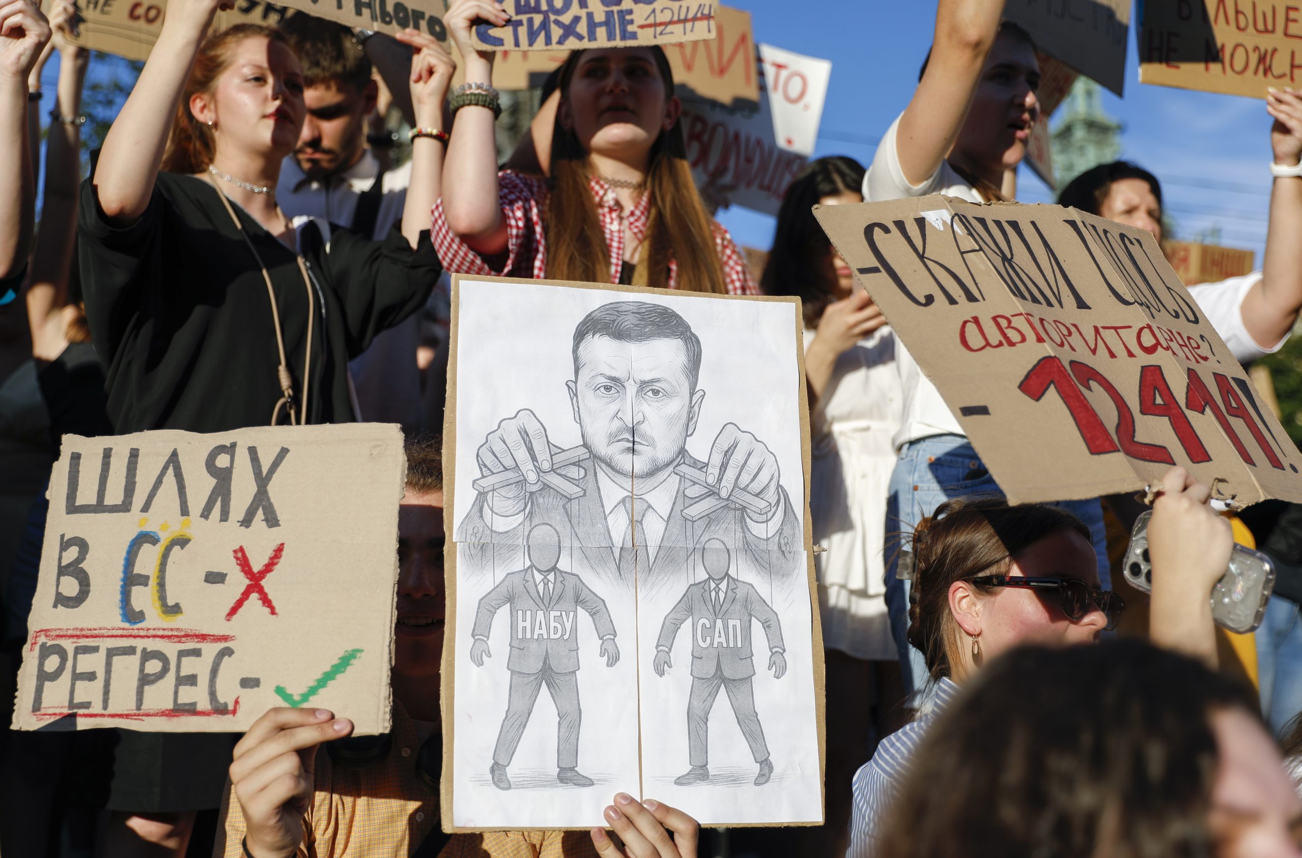 Az ukrán korrupcióellenes hatóságok függetlenségének megtartását követelik tüntetők a nyugat-ukrajnai Lembergben 2025. július 23-án. A kijevi parlament július 22-én elfogadott egy törvényjavaslatot, amely a főügyészség irányítása alá helyezi a mostanáig független intézményekként működő korrupcióellenes nyomozóhivatalt és a korrupcióellenes különleges ügyészséget, Volodimir Zelenszkij államfő pedig még aznap aláírta a törvényt (Fotó: MTI/EPA/Mikola Tisz)