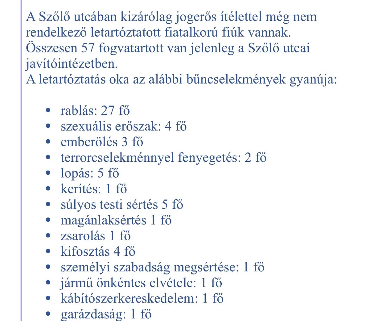 öten lopás miatt, egy ember kerítés miatt, öt fiatal súlyos testi sértés miatt, egy magánlaksértés, egy zsarolás, négy kifosztás, egy személyi szabadság megsértése miatt, egy fiatal jármű önkényes elvétele, egy kábítószer-kereskedelem és egy garázdaság miatt van az intézményben.