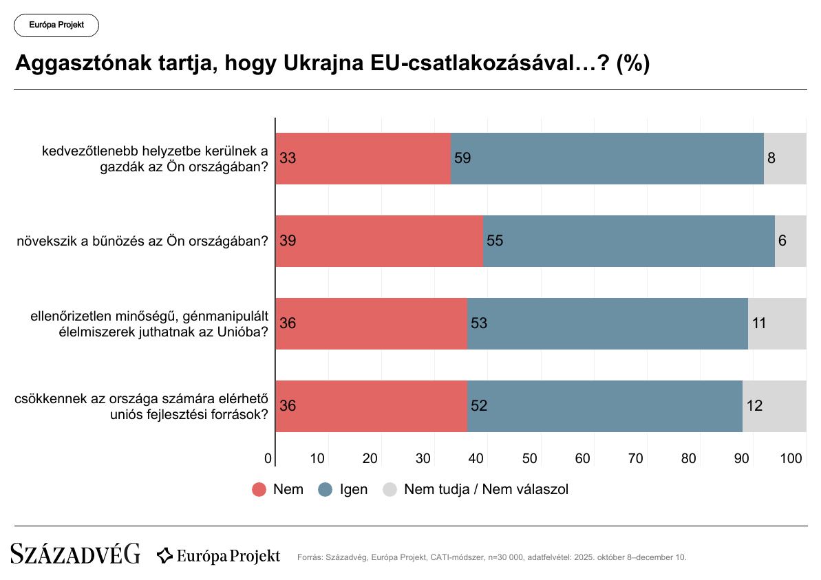 Ukrajna integrációja – a fegyveres konfliktus potenciális kiterjedésén túl – számos kockázatot hordoz. Az országban működő multinacionális vállalatok koncentráltan, alacsonyabb minőségi előírások mellett állítanak elő élelmiszereket, így az uniós piacvédelmi rendszer feloldása élelmiszerbiztonsági aggályokat vet fel, és nehéz helyzetbe hozhatja az uniós gazdákat. A Századvég mérése alapján mindkét szempont aggasztja az európaiakat: az előbbitől a válaszadók 53, az utóbbitól 59 százaléka tart.