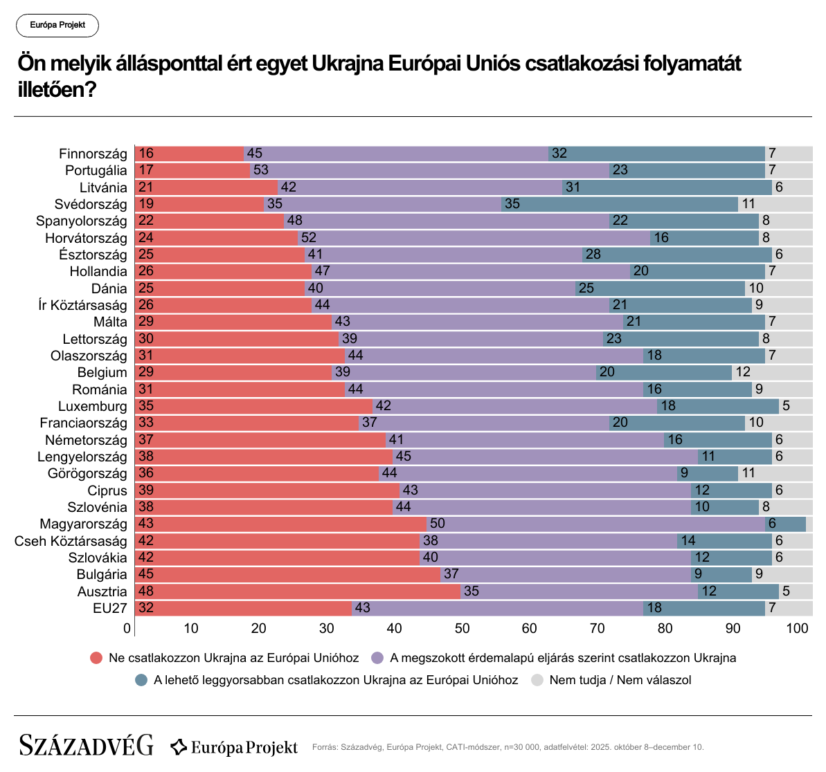 A brüsszeli elképzelést támogatók aránya még a leginkább Ukrajna-párti skandináv országokban is kisebbségben van: a svédek 35, a finnek 32 százaléka értene egyet Ukrajna feltétel nélküli beléptetésével. A skála másik végén Magyarország és Ausztria áll, ezekben az országokban a felnőtt lakosság 93 és 83 százaléka utasítja el az azonnali csatlakozást.