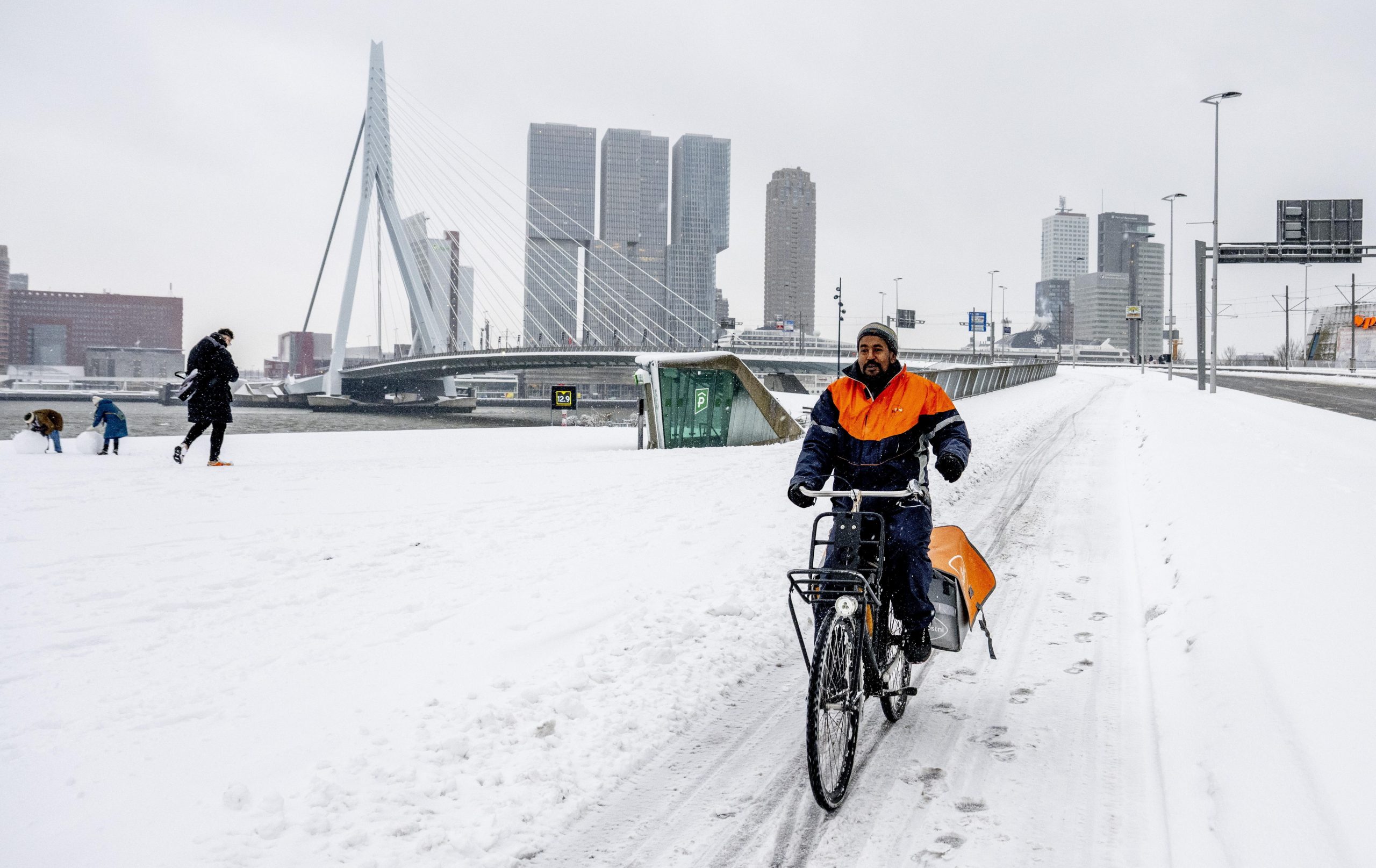 Egy kerékpáros postás a rotterdami Erasmus híd előtt 2026. január 7-én, amikor az erős havazás Hollandiában fennakadásokat okoz a közlekedésben és a mindennapi életben (Fotó: MTI/EPA/ANP/Robin Utrecht)