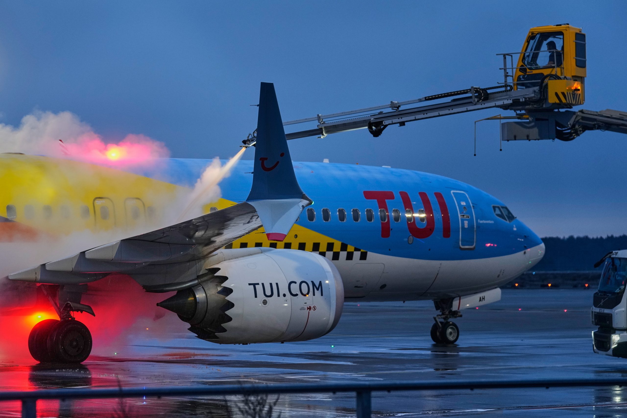 Repülőgépet jégmentesítenek a frankfurti repülőtéren 2026. január 5-én, amikor a levegő hőmérséklete mínusz 6 Celsius-fokra csökkent (Fotó: MTI/AP/Michael Probst)