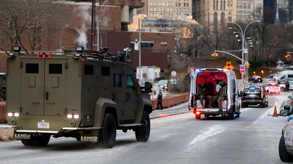 A Nicolás Maduro venezuelai elnököt és feleségét, Cilia Florest szállító páncélozott jármű a manhattani szövetségi bíróságra érkezik New Yorkban 2026. január 5-én (Fotó: MTI/AP/Stefan Jeremiah)
