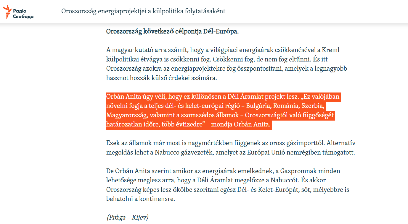 Arról Orbán Anita nem beszélt, miért is lenne rossz nekünk magyaroknak, ha lenne olyan vezeték is, amely megkerüli Ukrajnát - vagyis nem egyetlen tranzitország jóindulatától és oroszokhoz fűződő kapcsolatától függenénk. Jól látható, hogy Orbán Anita itt nem a magyar, hanem az ukrán érdekeket képviselte.