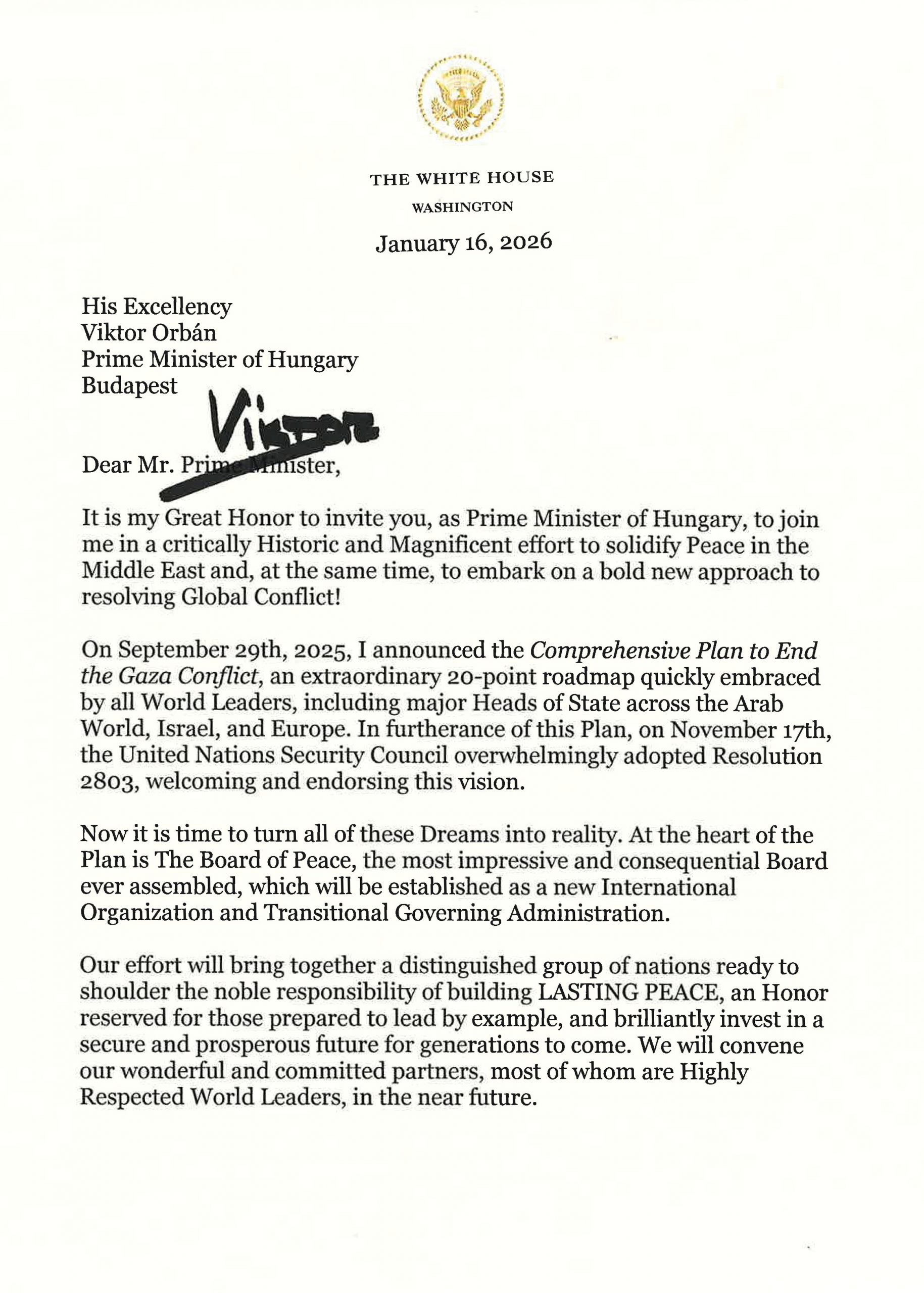 A Miniszterelnöki Kommunikációs Fõosztály által 2026. január 18-án közreadott képen Donald Trump amerikai elnök levele, amelyben meghívja Orbán Viktor miniszterelnököt a Gázai béketanácsba.