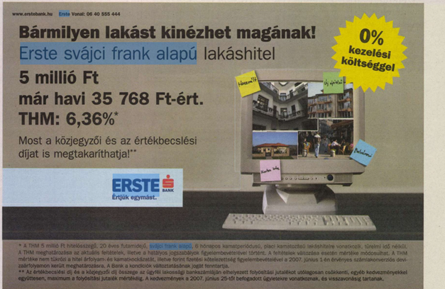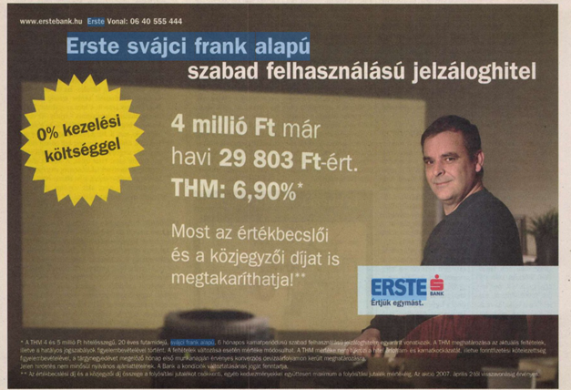 2004-ben nem csak arról nyilatkozott az Erste, hogy "minimálbér is elegendő a devizahitel felvételéhez" (ezt több bank is megtette), de az is kiderült, hogy az alacsonyabb jövedelműeknek magasabb kamatot számítottak fel.11