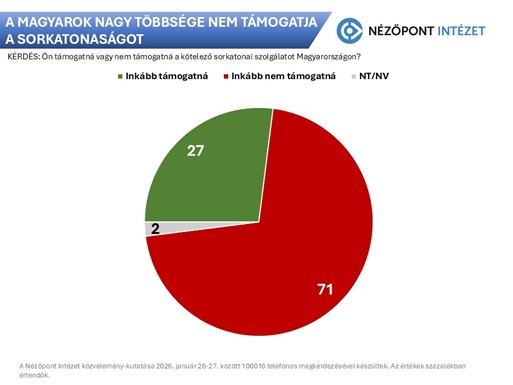 A Nézőpont Intézet közvélemény-kutatásban vizsgálta meg a sorkatonaság esetleges visszaállításának társadalmi megítélését Magyarországon. Az eredmény egyértelmű népszerűtlenséget mutat a magyarok körében, hiszen a teljes választókorú népesség több mint 70 százaléka nem támogatná a kötelező sorkatonai szolgálat bevezetését, sőt a kutatás nem talált olyan társadalmi csoportot, ahol ne lenne legalább kétharmados elutasítottsága ennek az intézkedésnek. Ezzel szemben a választók egynegyede egyetértene a sorkatonaság visszaállításával és mindössze két százaléknyian nem tudnak vagy akarnak állást foglalni a kérdésben.