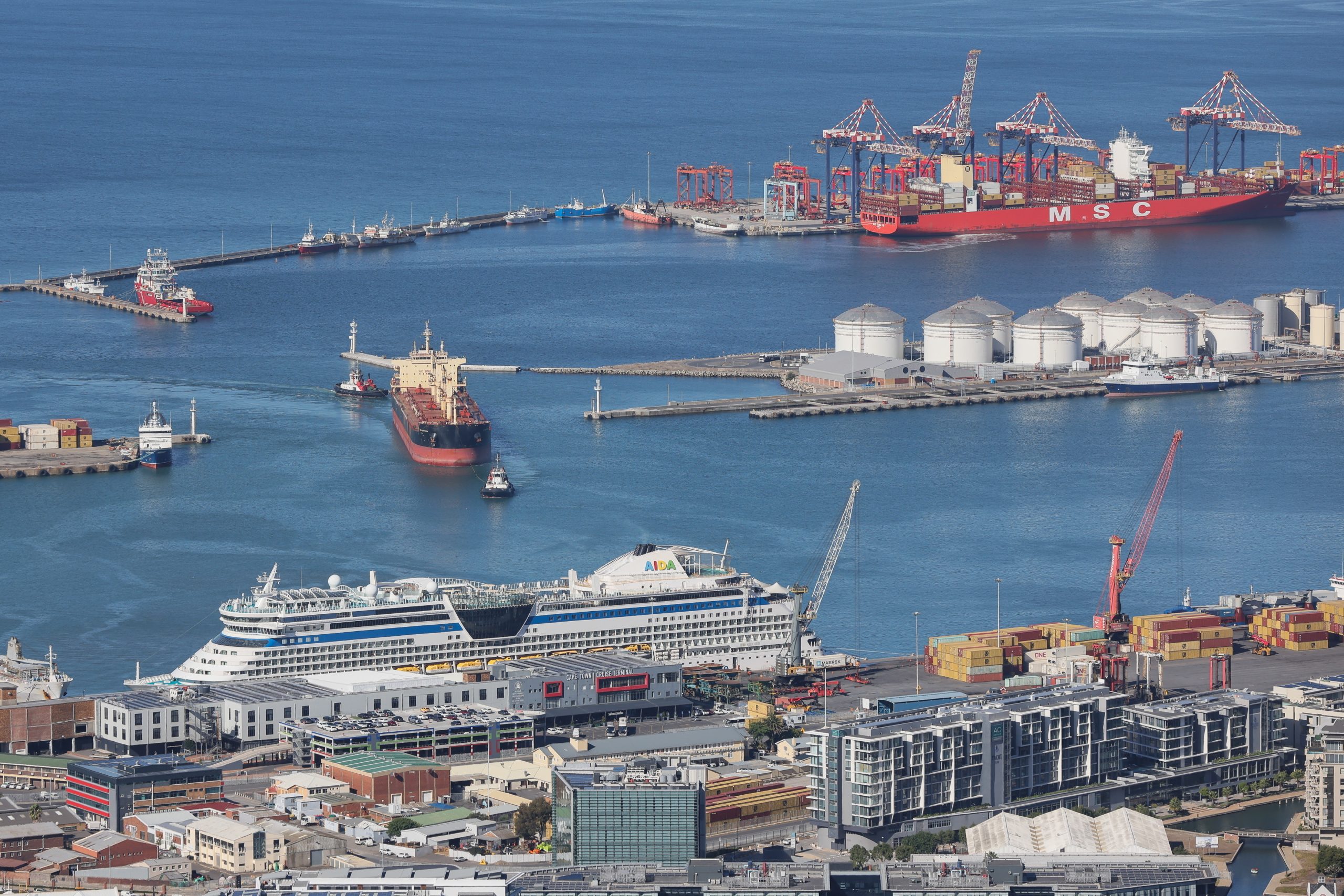 Konténerszállító hajók a dél-afrikai Fokváros kikötőjében 2026. március 2-án. Több hajózási társaság, köztük a dán Maersk és a francia CMA CGM közölte, hogy teherhajóikat Fokvároshoz irányítják át a Hormuzi-szoros lezárása miatt (Fotó: MTI/EPA/Halden Krog)
