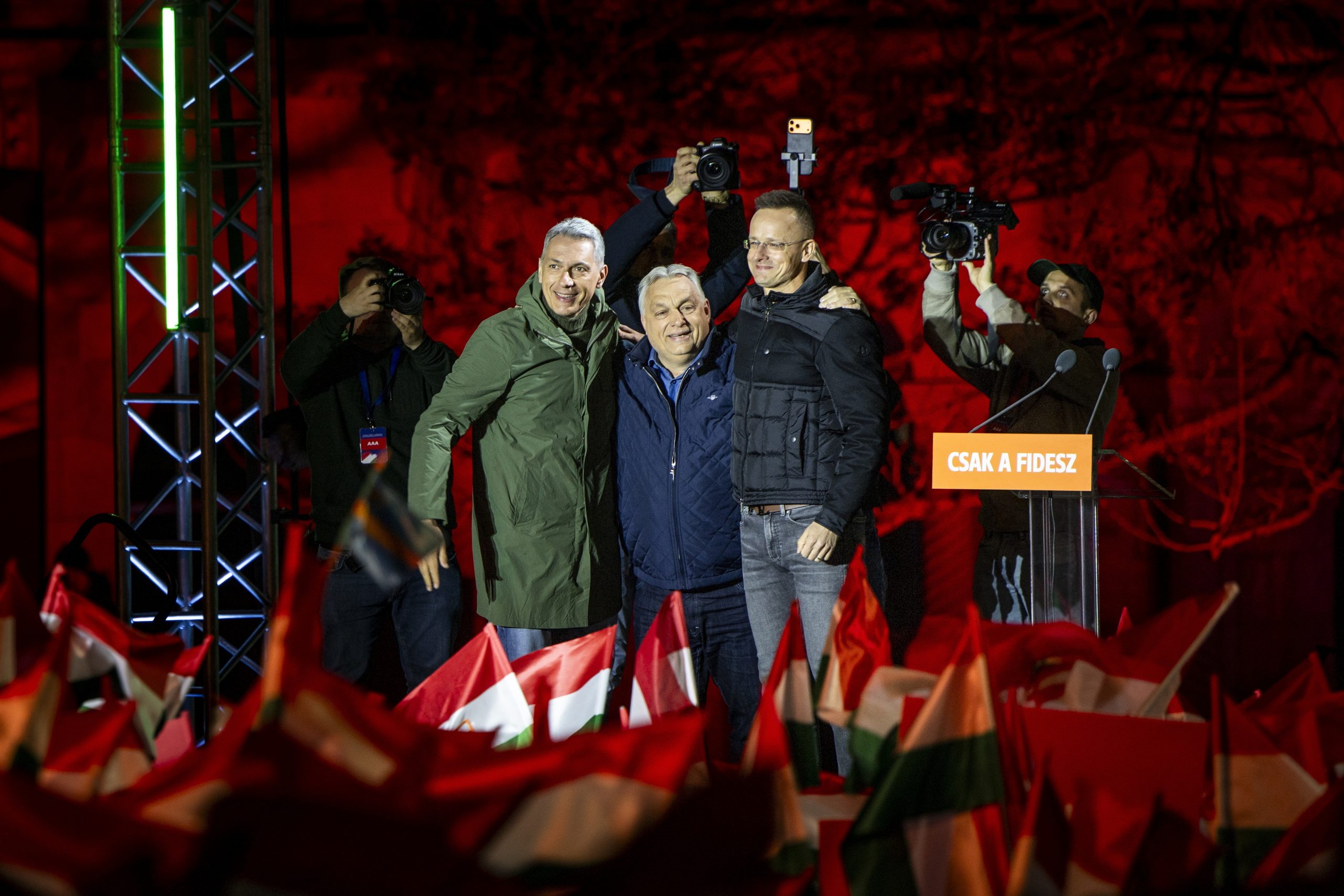 A Miniszterelnöki Kommunikációs Főosztály által közreadott képen Orbán Viktor miniszterelnök, a Fidesz elnöke (k), Lázár János építési és közlekedési miniszter (b) és Szijjártó Péter külgazdasági és külügyminiszter a Fidesz-KDNP kampányzáró rendezvényén az I. kerületi Szentháromság téren 2026. április 11-én – MTI/Miniszterelnöki Kommunikációs Főosztály/Fischer Zoltán