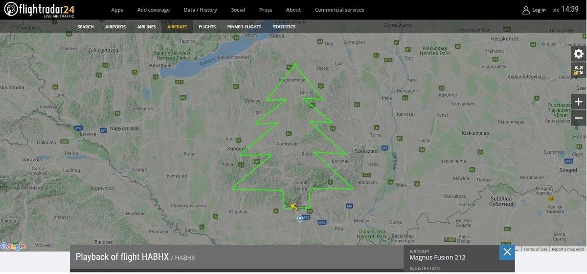 Hatalmas karácsonyfát rajzolt az ország egére négy magyar berepülőpilóta. A gigászi fenyő törzse Pécsnél, a csúcsa Siófoknál található, és csaknem két óráig tartott elkészíteni. A lenyomata pedig majd egy napig látszott a a Flightradar oldalán.