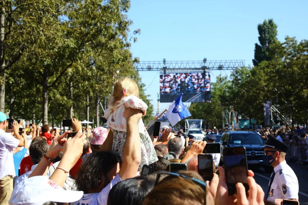 A jelenlévők hangos éljenzéssel, integetéssel köszöntötték a Ferenc pápát, a tömegben a többi között magyar, székely, lengyel, spanyol, portugál és vatikáni zászlókat lengettek.