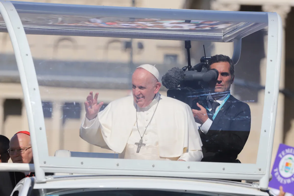 Ezután a pápamobilról köszöntötte a hívőket, majd megérkezett a Hősök terére, ahol nem sokkal később elkezdődött a Nemzetközi Eucharisztikus Kongresszus zárómiséje.