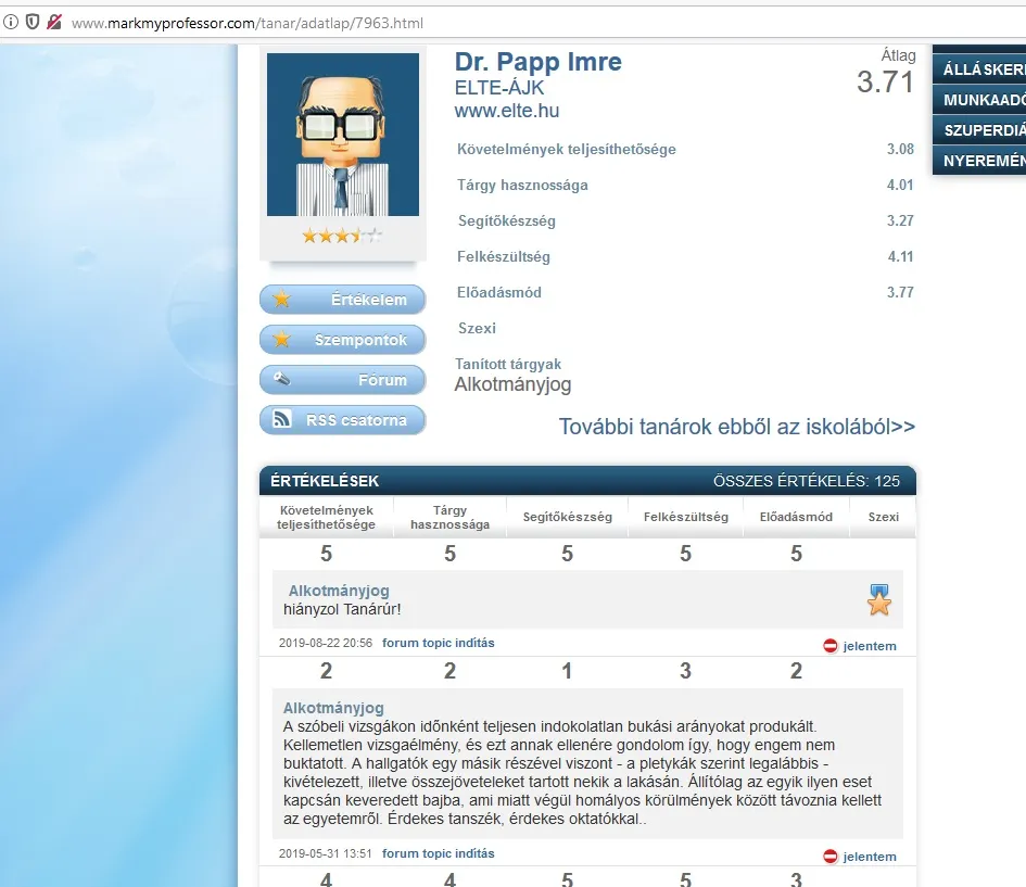 A tanárok minősítésére szolgáló markmyprofessor.com oldalon akadnak olyanok is, akik a zaklatási ügy ellenére rajongtak érte. De az egyik hozzászólásból az is kiderül, hogy a „pletykák szerint” dr. Papp Imre gyakran tartott kedvenc hallgatóinak, köztük a zaklatási ügy áldozatának a saját lakásán(!) magán-összejöveteleket.