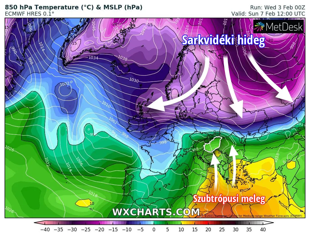 Hazánkban ennek ellenére szerencsésebben alakul a helyzet, a hétvégén kettészakad az ország, nagyobb hőmérsékleti kontraszt is kialakulhat. Míg délen bőven 10, néhol 15 fok feletti maximumokra van kilátás, addig északon 10, több helyen 5 fok alatt alakulhat a csúcshőmérséklet.